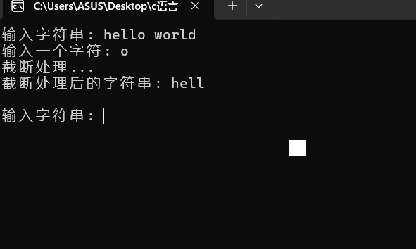 #include <stdio.h> #define N 80 #include <string.h> char* str_trunc(char* str, char x); int main() { char str[N]; char ch; while (printf("输入字符串: "), gets(str) != NULL) { printf("输入一个字符: "); ch = getchar(); printf("截断处理...\n"); str_trunc(str, ch); // 函数调用 printf("截断处理后的字符串: %s\n\n", str); getchar(); } return 0; } char* str_trunc(char* str, char x) { char* p = str; while (*p != x && *p != '\0') { p++; } if (*p == x) { *p = '\0'; } }
