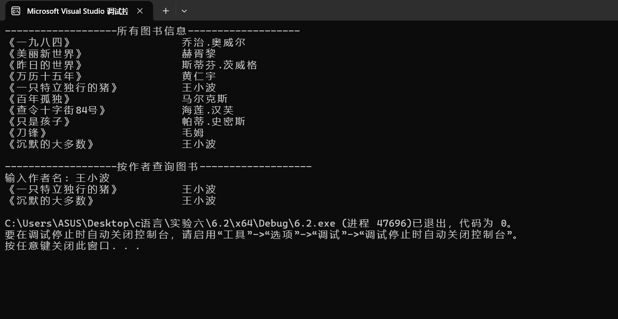 #include <stdio.h> #include <string.h> #define N 10 #define M 80 typedef struct { char name[M]; // 书名 char author[M]; // 作者 } Book; int main() { Book x[N] = { {"《一九八四》", "乔治.奥威尔"}, {"《美丽新世界》", "赫胥黎"}, {"《昨日的世界》", "斯蒂芬.茨威格"}, {"《万历十五年》", "黄仁宇"}, {"《一只特立独行的猪》", "王小波"}, {"《百年孤独》", "马尔克斯"}, {"《查令十字街84号》", "海莲.汉芙"}, {"《只是孩子》", "帕蒂.史密斯"}, {"《刀锋》", "毛姆"}, {"《沉默的大多数》", "王小波"} }; Book* ptr; int i; char author[M]; int found; // 使用指针遍历结构体数组 printf("-------------------所有图书信息-------------------\n"); for (ptr = x; ptr < x + N; ++ptr) printf("%-30s%-30s\n", ptr->name, ptr->author); // 查找指定作者的图书 printf("\n-------------------按作者查询图书-------------------\n"); printf("输入作者名: "); gets(author); found = 0; for (ptr = x; ptr < x + N; ++ptr) if (strcmp(ptr->author, author) == 0) { found = 1; printf("%-30s%-30s\n", ptr->name, ptr->author); } if (!found) printf("暂未收录该作者书籍!\n"); return 0; }