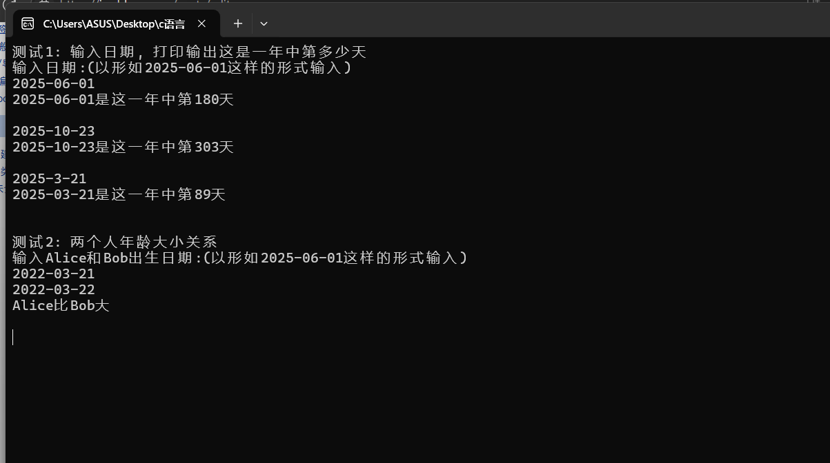 #define _CRT_SECURE_NO_WARNINGS #include <stdio.h> typedef struct { int year; int month; int day; } Date; // 函数声明 void input(Date* pd); // 输入日期给pd指向的Date变量 int day_of_year(Date d); // 返回日期d是这一年的第多少天 int compare_dates(Date d1, Date d2); // 比较两个日期: // 如果d1在d2之前,返回-1; // 如果d1在d2之后,返回1 // 如果d1和d2相同,返回0 void test1() { Date d; int i; printf("输入日期:(以形如2025-06-01这样的形式输入)\n"); for (i = 0; i < 3; ++i) { input(&d); printf("%d-%02d-%02d是这一年中第%d天\n\n", d.year, d.month, d.day, day_of_year(d)); } } void test2() { Date Alice_birth, Bob_birth; int i; int ans; printf("输入Alice和Bob出生日期:(以形如2025-06-01这样的形式输入)\n"); for (i = 0; i < 3; ++i) { input(&Alice_birth); input(&Bob_birth); ans = compare_dates(Alice_birth, Bob_birth); if (ans == 0) printf("Alice和Bob一样大\n\n"); else if (ans == -1) printf("Alice比Bob大\n\n"); else printf("Alice比Bob小\n\n"); } } int main() { printf("测试1: 输入日期, 打印输出这是一年中第多少天\n"); test1(); printf("\n测试2: 两个人年龄大小关系\n"); test2(); } // 补足函数input实现 // 功能: 输入日期给pd指向的Date变量 void input(Date* pd) { scanf_s("%d-%d-%d", &pd->year,&pd->month,&pd->day ); } // 补足函数day_of_year实现 // 功能:返回日期d是这一年的第多少天 int day_of_year(Date d) { int sum = 0; int a[12] = { 30,28,31,30,31,30,31,31,30,31,30,31 }; for (int i = 0; i < (d.month);++i) { sum+=a[i]; } if (d.year % 4 == 0) { if (d.year % 100 != 0) { sum += 1; } } return sum; } // 补足函数compare_dates实现 // 功能:比较两个日期: // 如果d1在d2之前,返回-1; // 如果d1在d2之后,返回1 // 如果d1和d2相同,返回0 int compare_dates(Date d1, Date d2) { if (d1.year < d2.year) { return -1; } else if (d1.year > d2.year) { return 1; } else { // 年份相同,比较月份 if (d1.month < d2.month) { return -1; } else if (d1.month > d2.month) { return 1; } else { // 月份相同,比较日期 if (d1.day < d2.day) { return -1; } else if (d1.day > d2.day) { return 1; } else { return 0; // 日期完全相同 } } } }