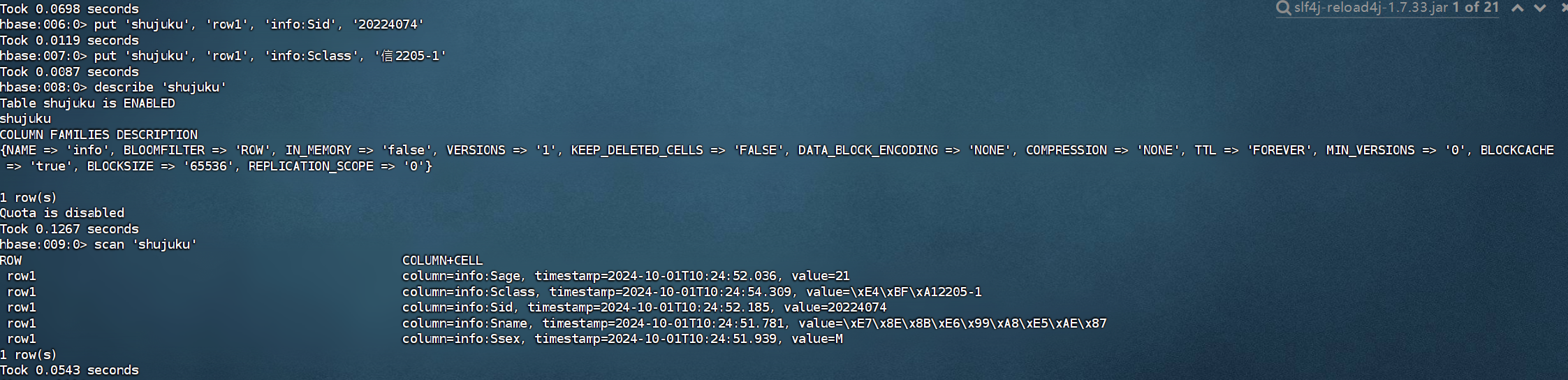 16. (选做题, 10分)安装HBase,并用create命令创建一个“shujuku”表,属性有:Sname,Ssex,Sage,Sid,Sclass,并添加自己的真实姓名,性别,年龄,学号,班级数据,通过describe命令查看“shujuku”表的基本信息,请截图展示。