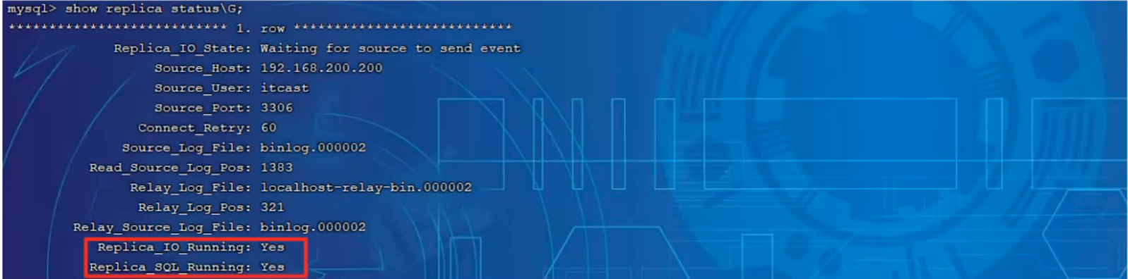 show replica status; #8.0.22之后 show slave status; #8.0.22之前只要如下是yes代表成功