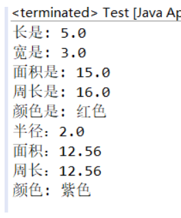颜色属性 color ,有两个构造方法(一个是默认的、一个是为颜色赋值的),还有3个抽象方法,分别是: getArea 计算面积、 getPer 计算周长、 showAll 输出所有信息,还有一个求颜色的方法 getColor 。