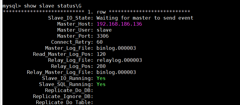 change master to master_host='192.168.186.136',master_user='slave',master_password='123',master_port=3306,master_log_file='binlog.000003',master_log_pos=120;