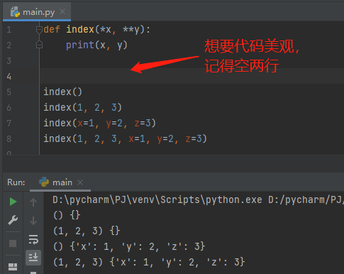 def index(*x, **y): # *表示参数会以元组的形式导入,存放所有未命名的变量参数;加了**的参数则会以字典的形式导入。 print(x, y) index() index(1, 2, 3) index(x=1, y=2, z=3) index(1, 2, 3, x=1, y=2, z=3)