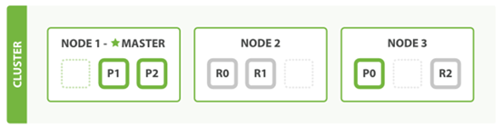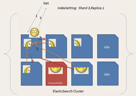 ES把数据分成多个shard,下图中的P0-P2,多个shard可以组成一份完整的数据,这些shard可以分布在集群中的各个机器节点中。随着数据的不断增加,集群可以增加多个分片,把多个分片放到多个机子上,已达到负载均衡,横向扩展。