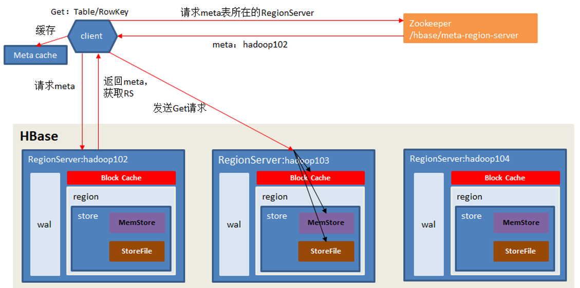 - 访问对应的Region Server,获取hbase:meta表,根据读请求的namespace:table/rowkey,查询出目标数据位于哪个Region Server中的哪个Region中。并将该table的region信息以及meta表的位置信息缓存在客户端的meta cache,方便下次访问。