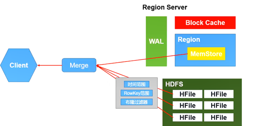 - 分别在Block Cache(读缓存),MemStore和Store File(HFile)中查询目标数据,并将查到的所有数据进行合并。此处所有数据是指同一条数据的不同版本(time stamp)或者不同的类型(Put/Delete)。