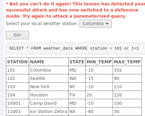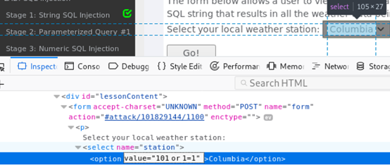 如图所示,需要我们通过数字注入,使其可查询Columbia的天气信息,于是在选择框中,选择Colombia,右键,选择插入审查元素,在value=“101”之后添加 or 1=1。按下GO!