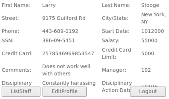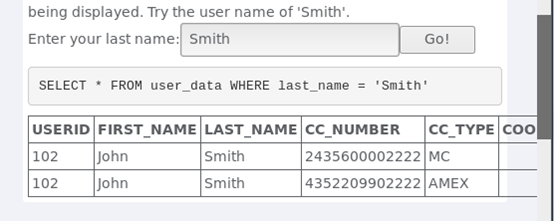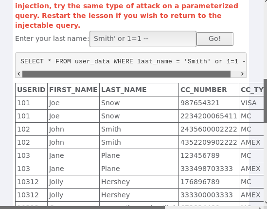 将 '' 中提前闭合,插入永真式然后注释掉后面的内容就可以了,所以输入 Smith' or 1=1 -- 注入成功后,便可看到所有员工的信息: