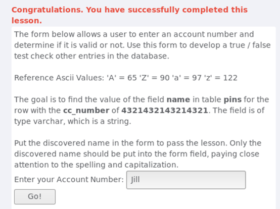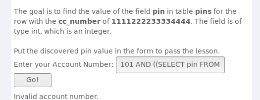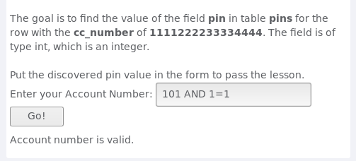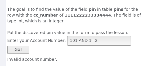 我们的目标是找到pins表中cc_number字段值为1111222233334444的记录中pin字段的数值。pin字段类型为int型。输入找到的数值并提交