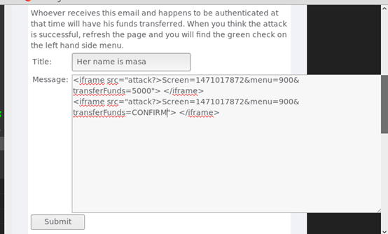 <iframe src="attack?Screen=1471017872&menu=900&transferFunds=5000"> </iframe>
