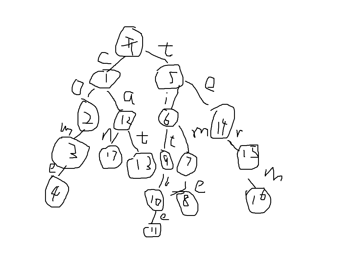 上图就是依次将 come、time、title、cat、term、can这几个字符存入到字典树的图像。