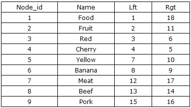 CREATE PROCEDURE [dbo].[DelNode] ( @node_id int ) AS declare @lft int declare @rgt int if exists(select Node_id from Tree where Node_id = @node_id) begin SET XACT_ABORT ON BEGIN TRANSCTION select @lft = Lft, @rgt = Rgt from Tree where Node_id = @node_id delete from Tree where Lft >= @lft and Rgt <= @rgt update Tree set Lft = Lft – (@rgt - @lft + 1) where Lft > @lft update Tree set Rgt = Rgt – (@rgt - @lft + 1) where Rgt > @rgt COMMIT TRANSACTION SET XACT_ABORT OFF end GO