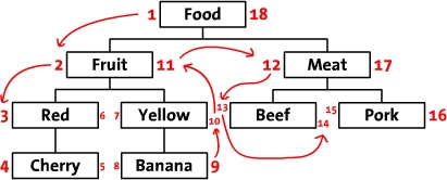 第一次看见这种表结构,相信大部分人都不清楚左值(Lft)和右值(Rgt)是如何计算出来的,而且这种表设计似乎并没有保存父子节点的继承关系。但当你用手指指着表中的数字从1数到18,你应该会发现点什么吧。对,你手指移动的顺序就是对这棵树进行前序遍历的顺序,如下图所示。当我们从根节点Food左侧开始,标记为1,并沿前序遍历的方向,依次在遍历的路径上标注数字,最后我们回到了根节点Food,并在右边写上了18。
