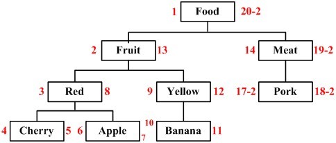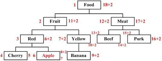 依据此设计,我们可以推断出所有左值大于2,并且右值小于11的节点都是Fruit的后续节点,整棵树的结构通过左值和右值存储了下来。然而,这还不够,我们的目的是能够对树进行CRUD操作,即需要构造出与之配套的相关算法。