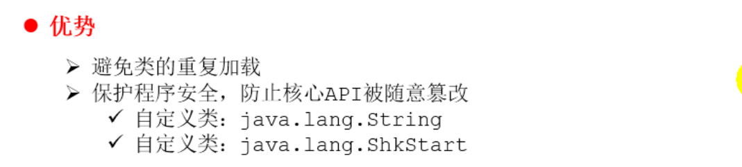 比如:我们自己定义了一个java.lang.String类但是根据双亲委派机制会让引导类先加载。这就是沙箱安全机制