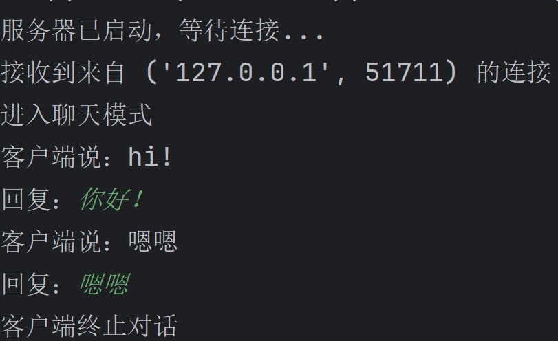 (1)创建服务端和客户端,选择一个通信端口,用Python语言编程及通过socket套接字实现通信演示程序;