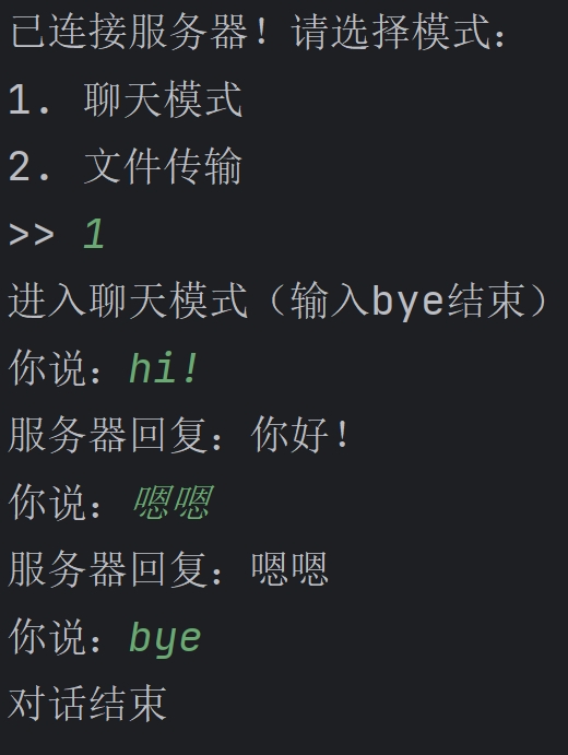 若选择交流,则客户端和服务端一句一句进行互相交流,直至输入