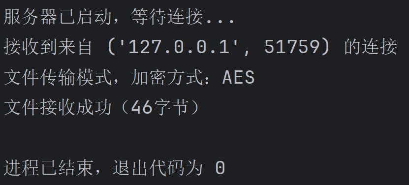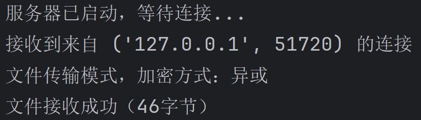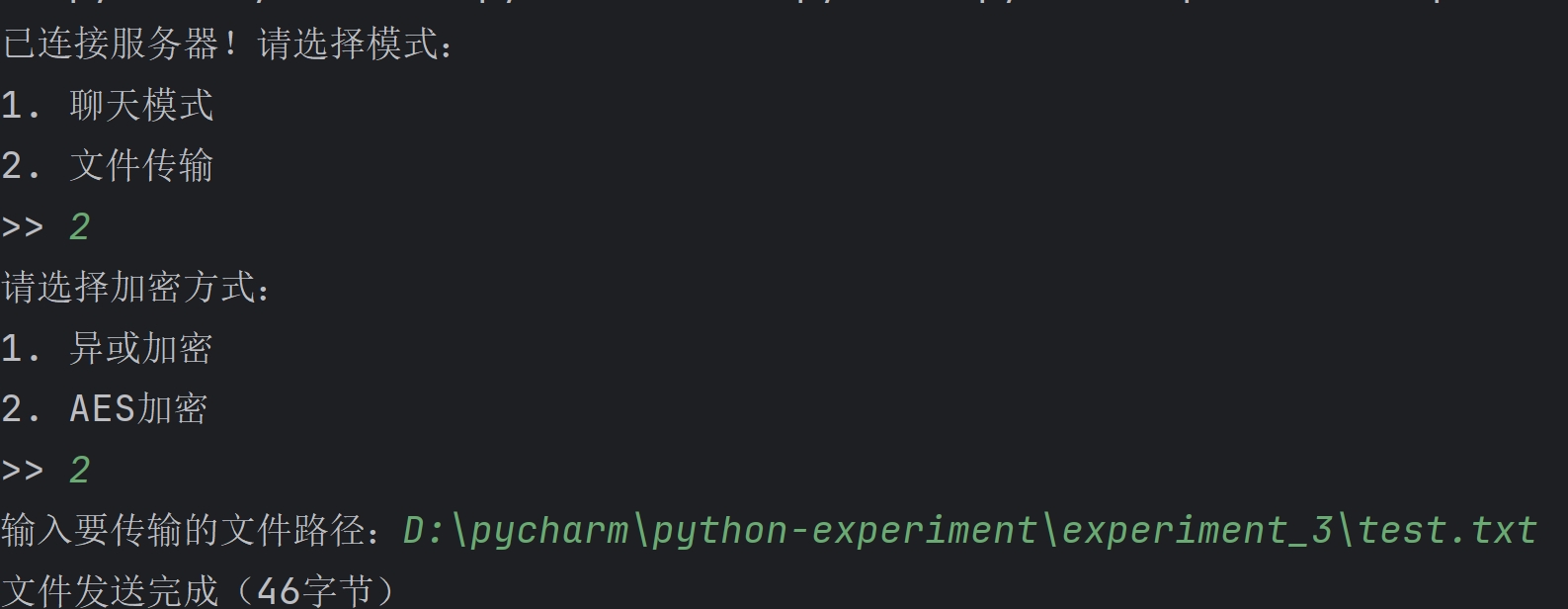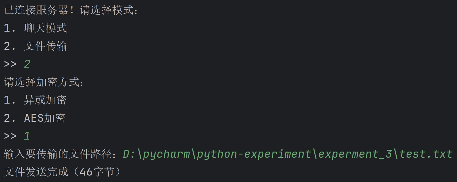 print(f"文件传输模式,加密方式:{'异或' if encrypt_type == '1' else 'AES'}")