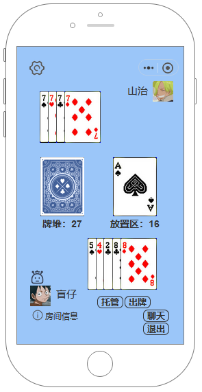 游戏界面:具有托管和即时聊天功能,房管可以进行房间信息设置。