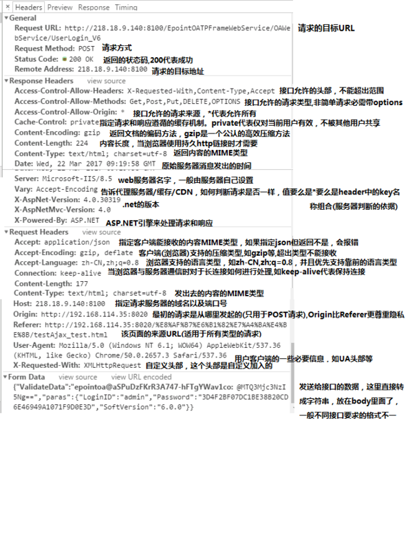 上述请求是一个正确的请求,为了方便,我把每一个头域的意思都表明了,我们可以清晰的看到,接口返回的响应头域中,包括了