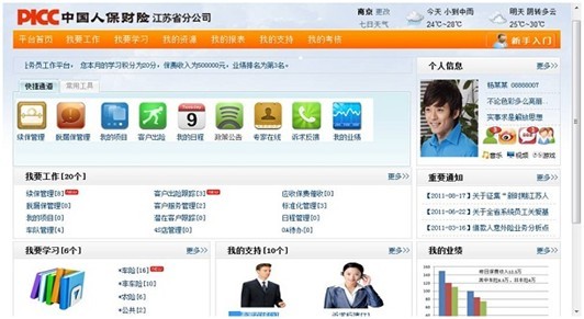 对于江苏PICC的业务人员来讲,这一年他们的福利可不小。在公司信息技术部总经理周敏的领导下,江苏PICC业务员门户在2013年全面成型,开放给业务人员进行日常办公。从下边这张协同截图上就能够感受下江苏PICC业务员的美好生活吧!进入系统第一眼,你就能看到你在业绩目标完成情况以及在团队中的排名,心中有数之后就开始精力充沛的一天吧:哪些老客户该续保了,哪些潜在客户该打个电话或者约见下了,哪个客户保费该催了,是否有脱漏保客户需要跟踪回访……遇到疑难问题,随时就能获得专家支持!做完一天之中最重要的客户联络之后,还可以看看有哪些新的保险产品推出,有哪些重要的新闻通知!当然,业务员还可以在这个平台上随时获取个人的业绩报表,看看业务的短板在哪里,以明确接下来工作的重心以及需要在哪些方面发力。对于业务团队的负责人来讲,这样的数据更显得尤为重要,这让他能够更好地帮助下属完成目标绩效。最重要的,对于业务部门的员工而言,有了业绩,年终奖也就不再是个问题!