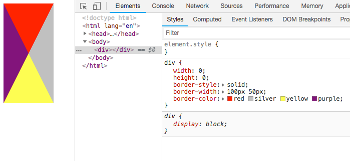 如图,矩形是由四个三角形边框组成的,只要设置其它边颜色为透明,就可以获得单独的三角形。