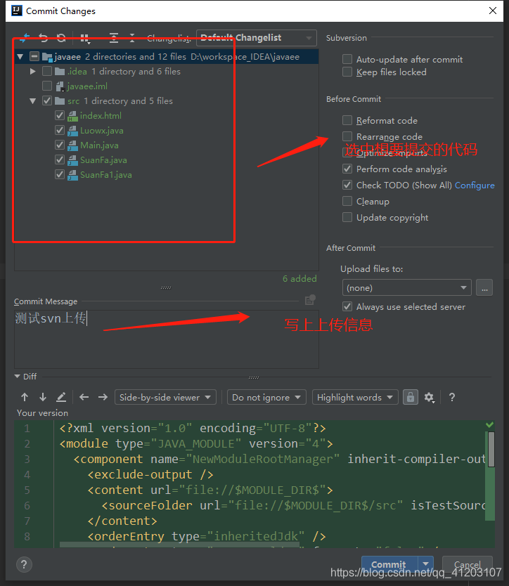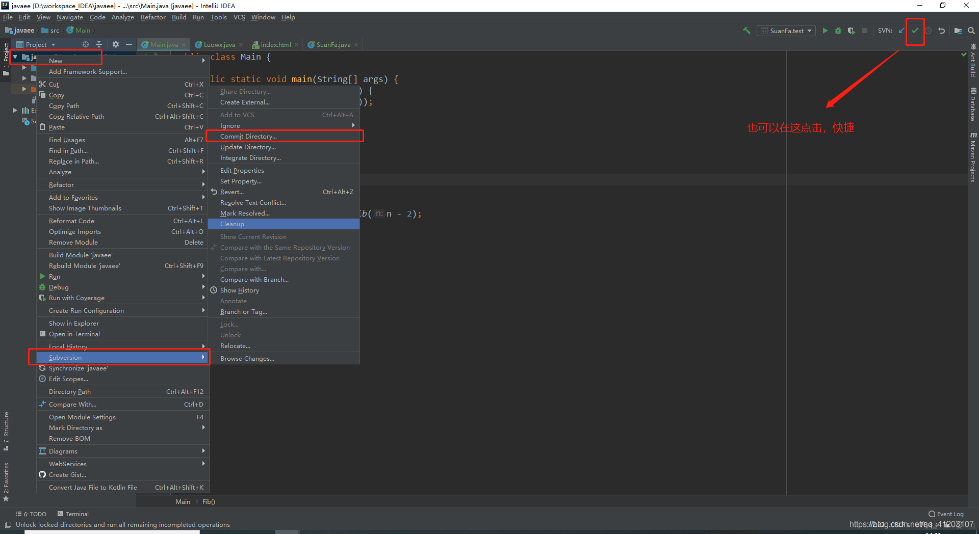 最后一步,就可以完成,点击右上角的✔,或者右键项目找到svn中的commit Directory。选中想要提交的代码和写上上传信息,一般日常开发都是写上自己修改或新增了什么功能。然后commit确定,就完成了svn的托管。