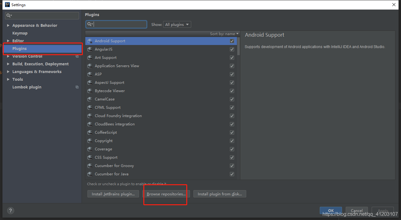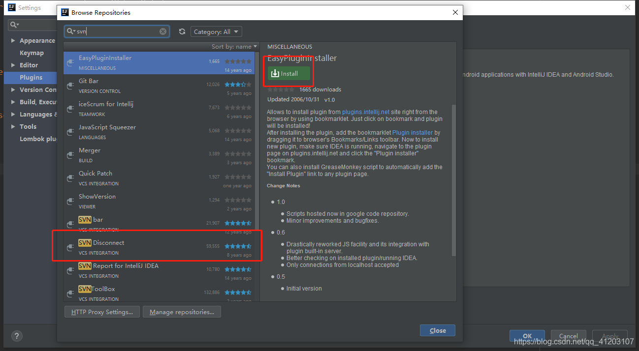 点击右上角file,选中settings,找到plugins,18版之前的idea还选用点击下面红框的Browse repositories…,然后再列表中输入svn,找到SVN Disconnect,然后点击右边的install安装,重启idea。