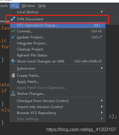 然后打开导航栏的VCS,就会发现多了个选项哈哈哈哈哈,截图截的头皮发麻,多的选项就是SVN Disconnect,点击就可以把项目取消svn托管。
