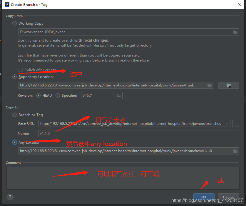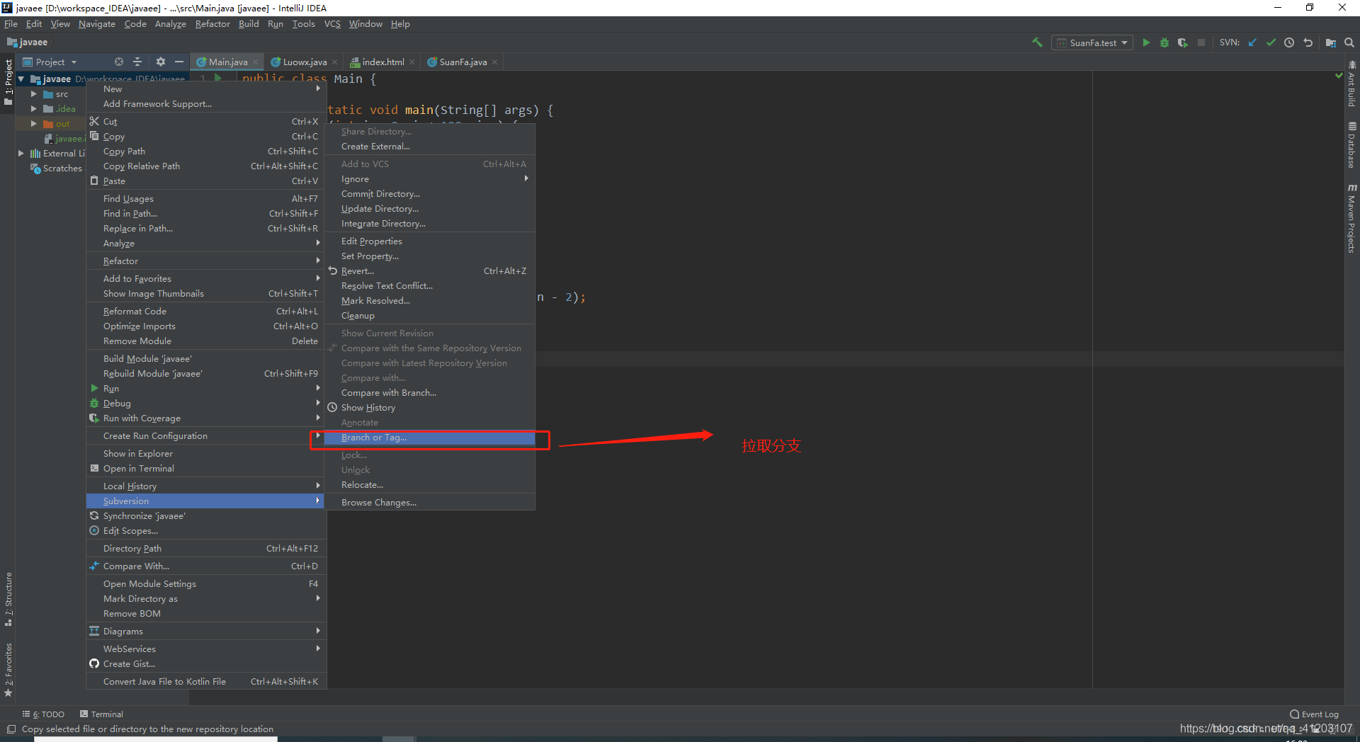 右键项目,选中svn,选中Branch or Tags。然后。。。(省略好多字)。看下图操作