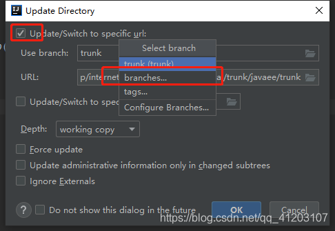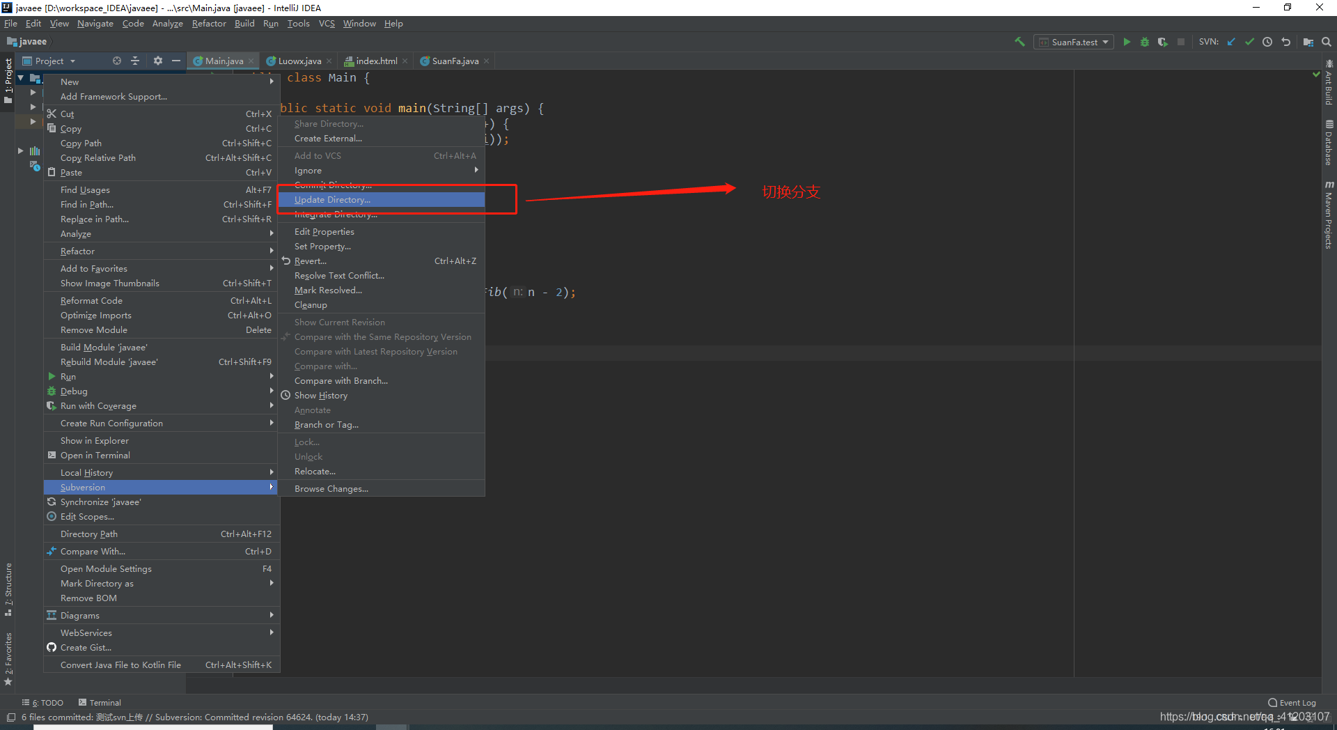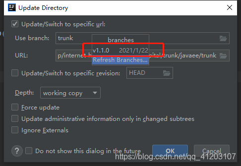 然后勾选update/switch to …,点击主分支,选择分支,如果没出现刚刚新拉取的分支,则刷新下分支,选择刚刚创建的分支,这时候就能看到已经切换到分支上了。具体看图