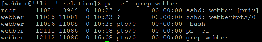 sshd程序调用login程序,抛出一个登录shell(图中PID为11081),此时该进程权限为root权限,同时,打开文件描述符0,1,2,方便用户进行输入用户名密码这两个简单的交互,如果用户名密码准确无误,则fork一个新的进程作为控制终端(pts/0,该进程ID为11085),并降低权限,由root权限更改为登录用户名对应的权限。最后,由控制终端fork一个控制进程,来作为与控制终端连接的会话首进程,也就是图中的PID为11086的进程,至此,一个完整的会话建立完毕,我们在这个伪终端中执行的任何命令的进程的PPID都应该为11086(如图中ps -ef ,grep webber的父进程都是11086),因为它们都是在这个会话中完成的,而这个会话首进程的进程组ID为11086.