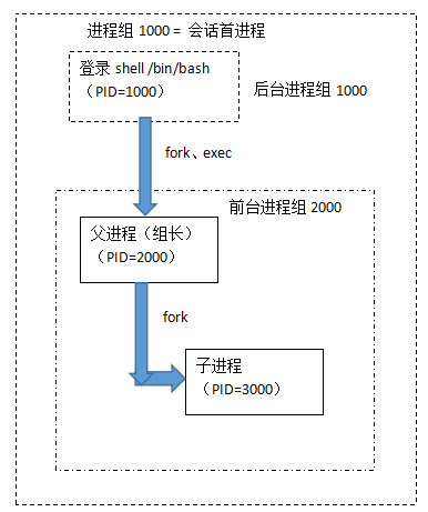 注:一个会话只能有一个前台进程组,其他进程组为后台进程组。在终端键入中断键(Ctrl+C),都会将信号送到前台进程组fg,如果将挂断信号发送到控制进程(会话首进程11086),则pts断开连接。
