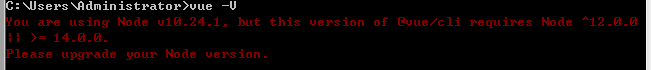 翻译:您正在使用Node v10.24.1,但是这个版本的@vue/cli需要Node ^12.0.0 || >= 14.0.0。请升级您的Node版本。