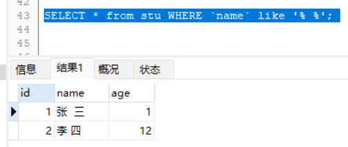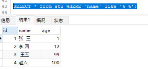 注:学生表中5条记录,1中间有空格,2的中间右边都有空格,3的左边有空格。4的右边有空格,5的名字中没有空格。