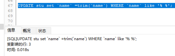 UPDATE stu set `name` =trim(`name`) WHERE `name` like '% %';