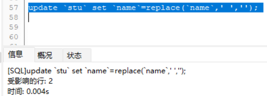 注:影响了两行记录,此时就是1,2,其实,replace方法,也能去掉两端的空格。不用trim,上述一条sql就能把空格全去掉。