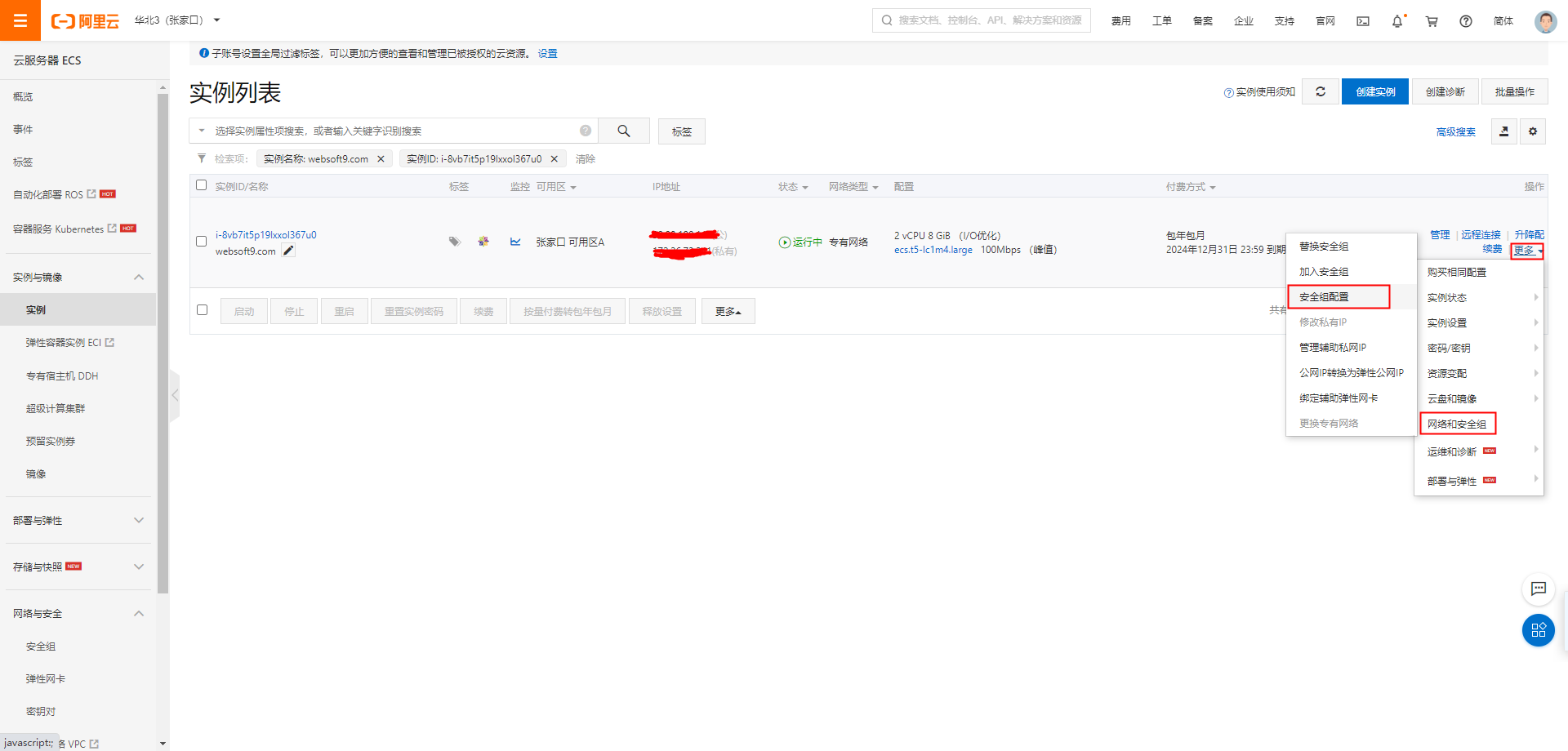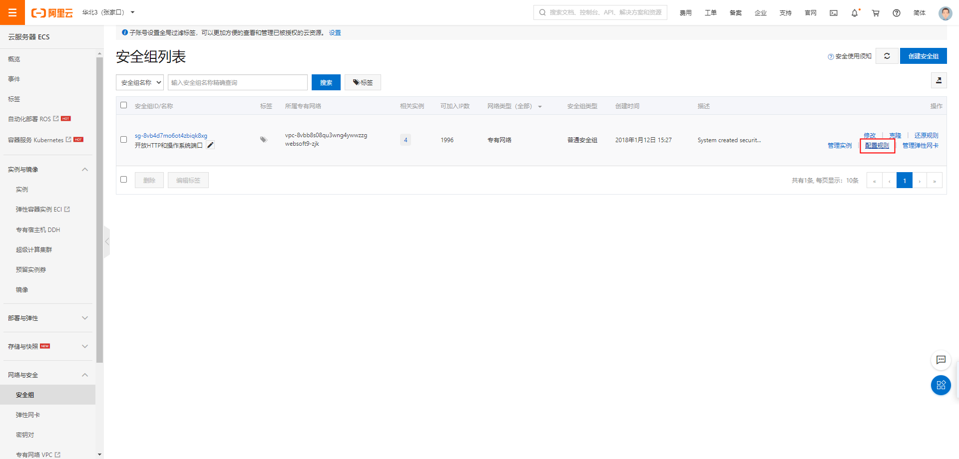 第一,找到对应的实例,通过安全组配置选项进入设置。