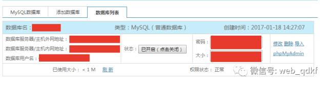 我这边用的空间商,是提供空间管理自主平台的,所以我的数据库,是我自己建立的。为了数据安全,我将相关信息进行了遮罩处理。