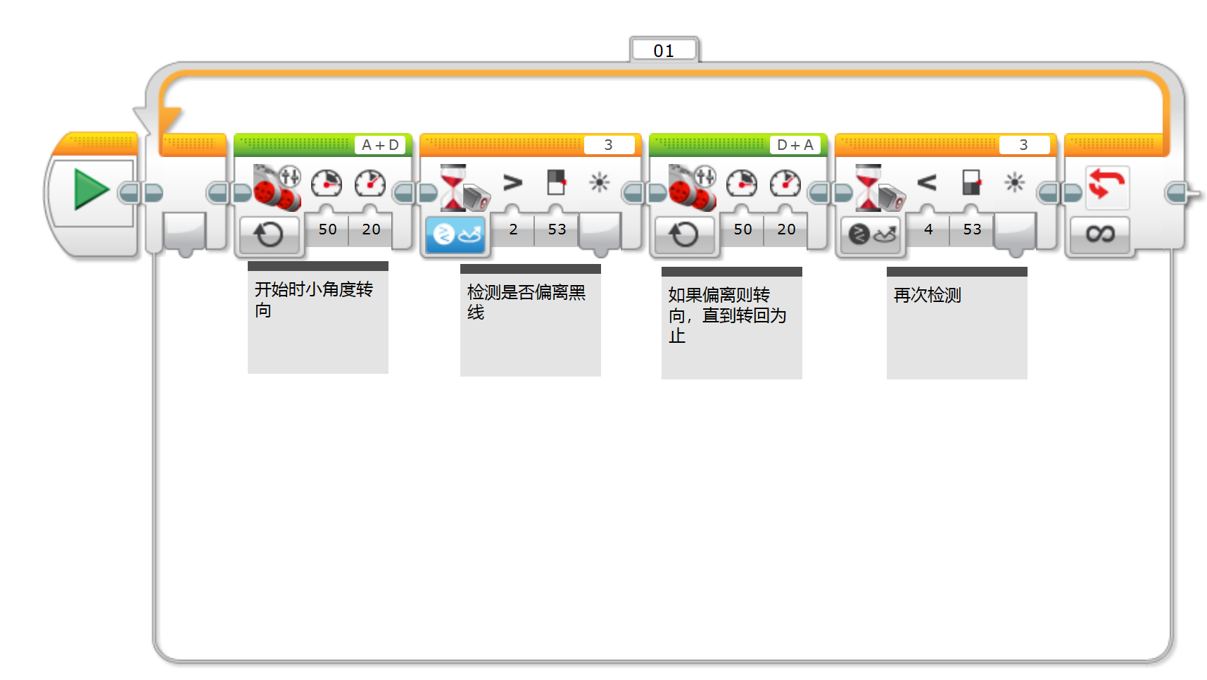 巡线执行经过:颜色传感器检测感应中心的反射光强度值,如果检测数值与黑线一致就继续前行,否则就进行小角度转向,尝试回到黑线上。程序如下: