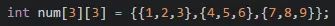 定义了一个名称为num,数据类型为int的二维数组。其中第一个[3]表示第一维下标的长度,就像购物时分类存放的购物;第二个[3]表示第二维下标的长度,就像每个购物袋中的元素。