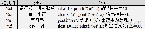 | %d | 带符号十进制整数 | int a = 10;printf("%d",a);输出结果位10 |