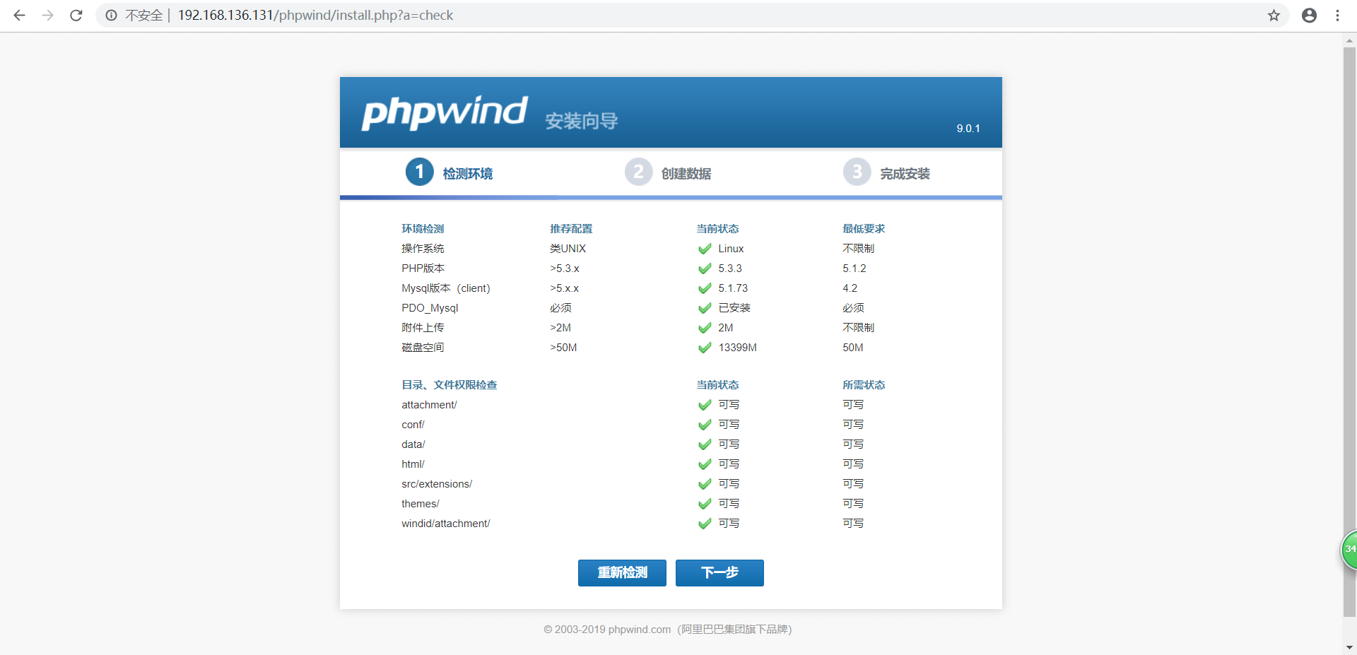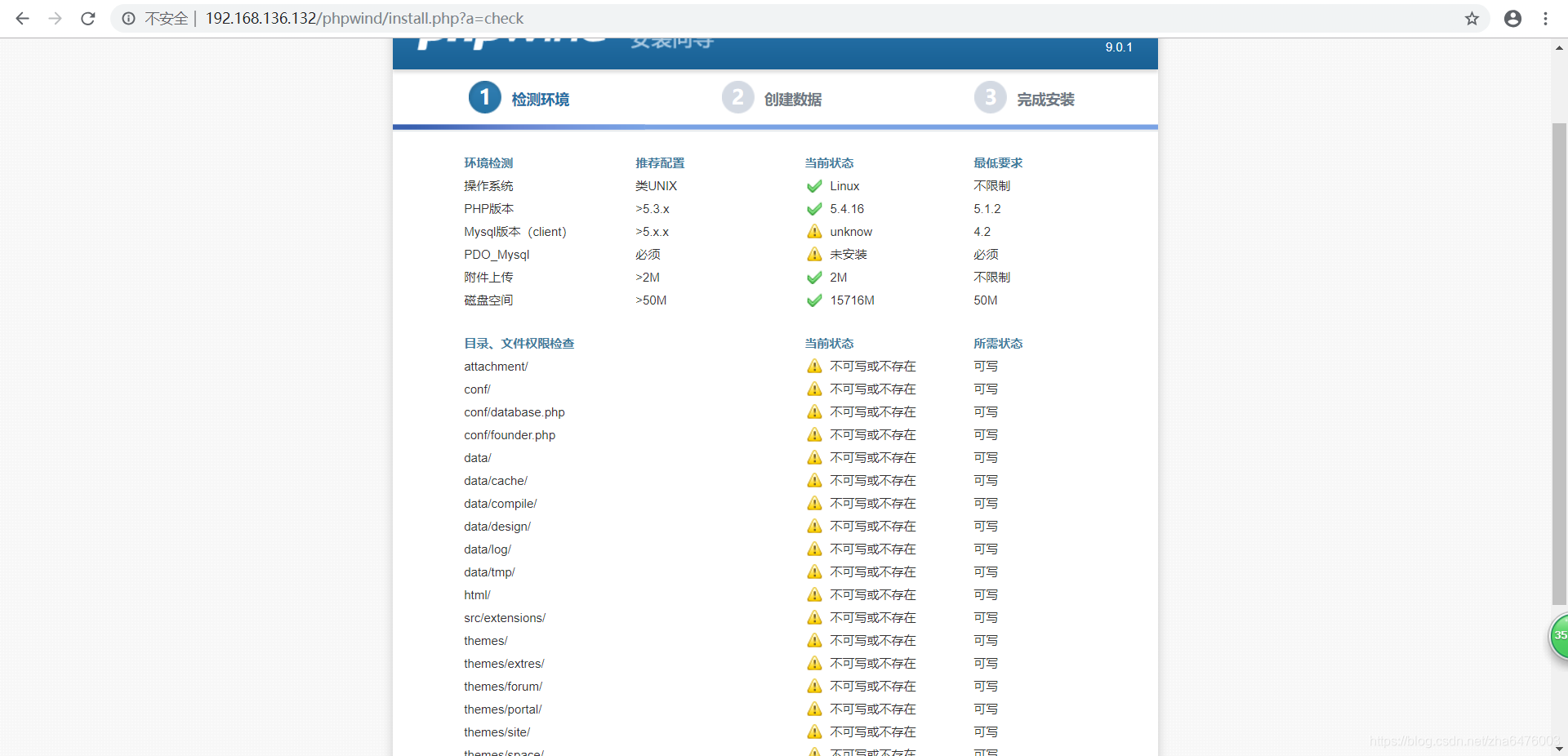 上半部分的问题是缺少php扩展安装即可,如果确定已经执行chmod -R 777 phpwind下半部分出现这种情况就是防火墙问题