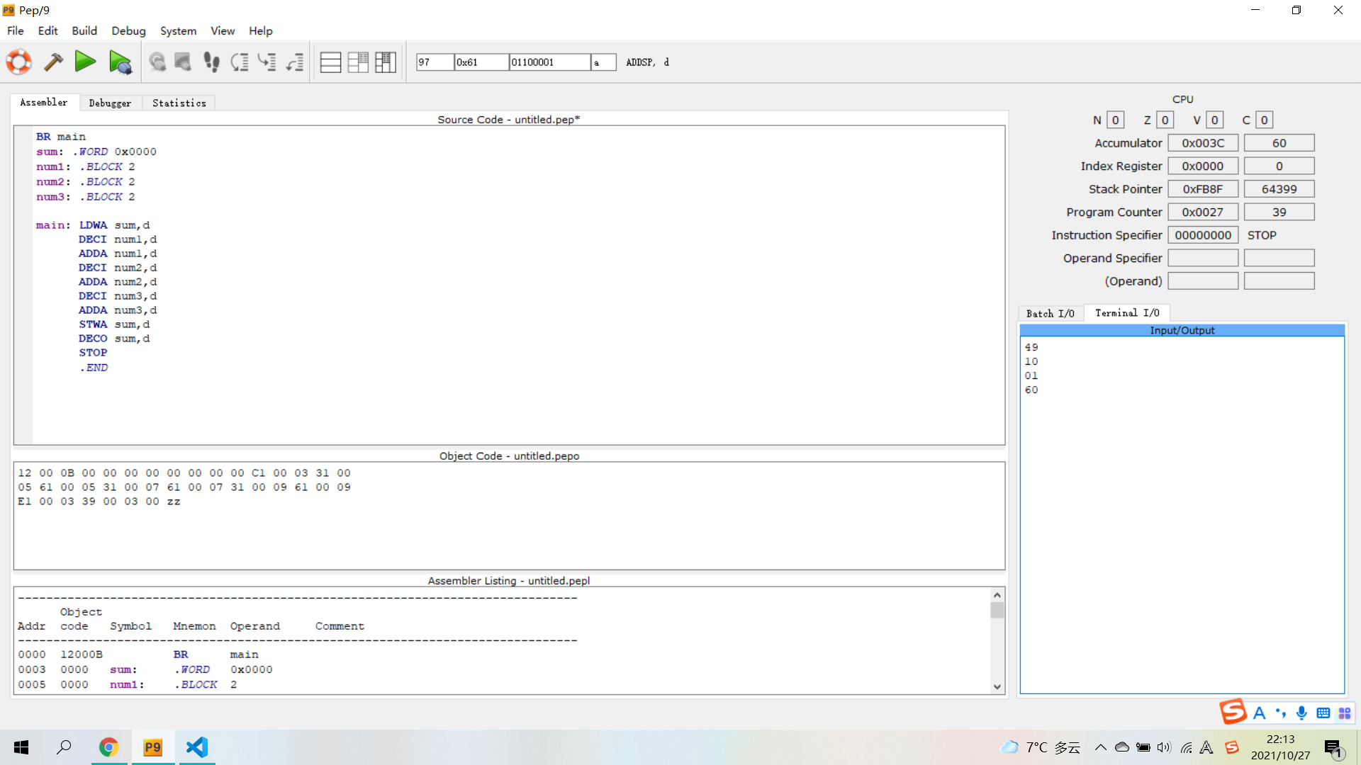 (2)用PEP/9 机器指令实现(1)中的算法,提交测试结果截图。