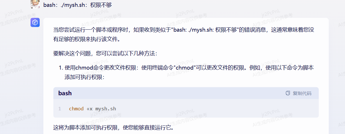 执行时发现提示权限不够,询问gpt得知可以用chmod +x mysh.sh,为脚本添加可执行权限。