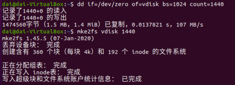 在一个名为vdisk的虚拟磁盘文件上创建一个EXT2文件系统,有1440个大小为1KB的块。