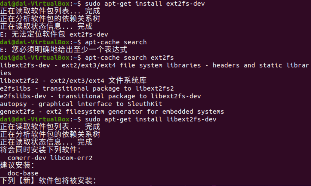 在安装ext2fs开发包时,使用书本上给出的代码显示无法定位软件包。