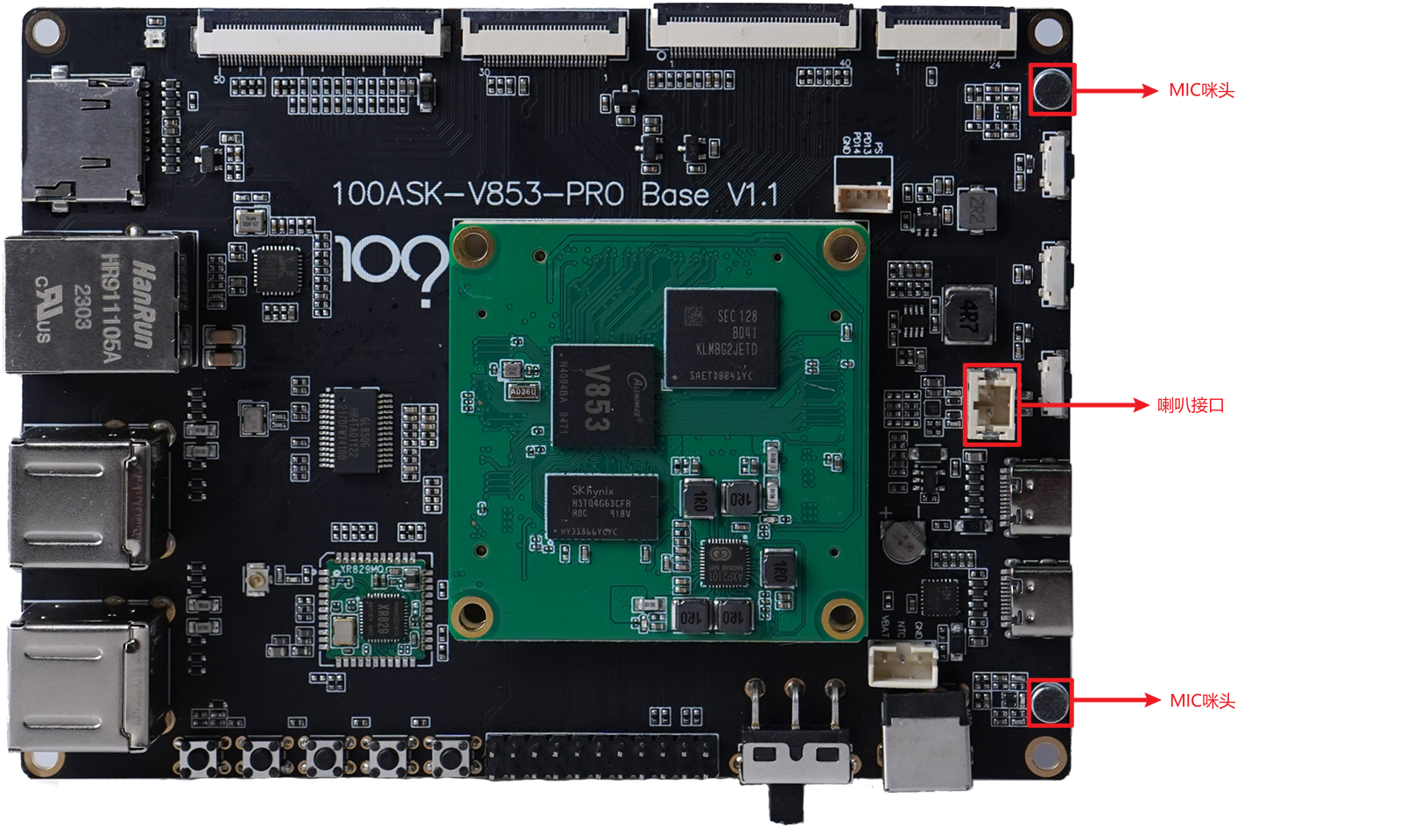 V853 芯片提供了 AudioCodec(芯片内置音频接口) x1、I2S/PCM(数字音频接口) x2、DMIC(外置数字 MIC 接口) x1,可以满足各类音频需求。100ASK_V853-PRO开发板板载两个MIC拾音咪头和喇叭接口。如下图所示: